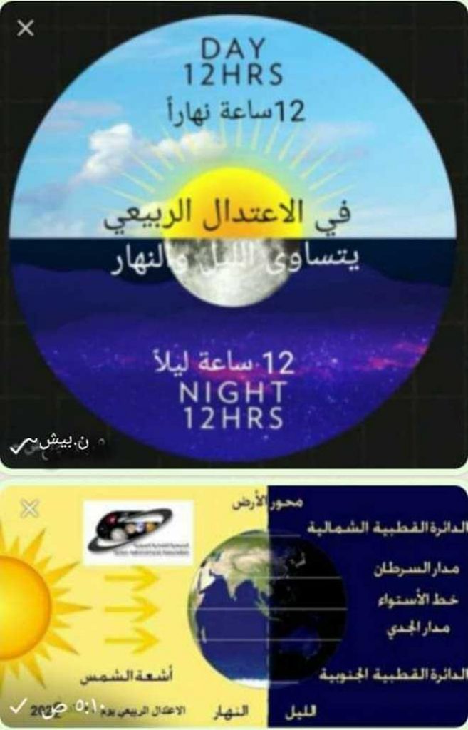 وأضاف: في الاعتدال أيضاً يصبح الخط الفاصل بين النهار والليل عمودياً ويربط بين القطبين الشمالي والجنوبي.