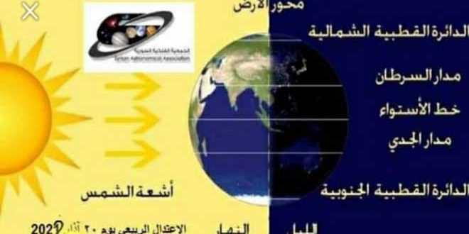 يبدأ اليوم في الساعة الخامسة و33 دقيقة بعد الظهر بتوقيت دمشق الاعتدال الربيعي في النصف الشمالي من الكرة الأرضية والاعتدال الخريفي في نصف الكرة الجنوبي حيث يتساوى طول الليل والنهار في هذا اليوم وفقاً للجمعية الفلكية السورية.