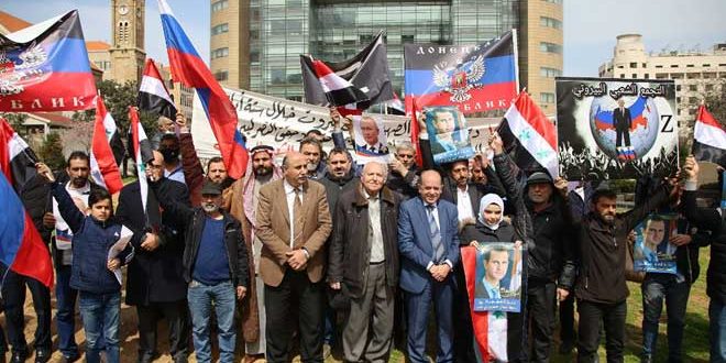 بدوره اشار رئيس العمال السوريين في لبنان مصطفى منصور إلى ان روسيا ستنتصر على أعدائها كما فعلت سورية وأن هذا الغرب ومرتزقته سيدفعون ثمن جرائمهم مؤكداً أن سلاح العقوبات الذي ستخدمونه سيفشل مثلما فشل إرهابهم العسكري والسياسي.