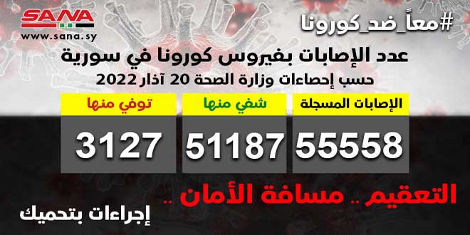 وأوضحت الوزارة في بيان تلقت سانا نسخة منه أن عدد الإصابات المسجلة في سورية بلغ حتى الآن 55558 شفيت منها 51187 حالة وتوفيت 3127 حالة.