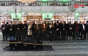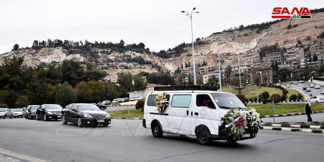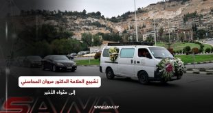 وشيع جثمان الراحل المحاسني الذي توفي أمس عن عمر 96 عاماً من مشفى الشامي بدمشق حيث صلي على جثمانه عقب صلاة العصر في جامع سعد بن معاذ ليوارى الثرى في مقبرة الباب الصغير.