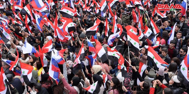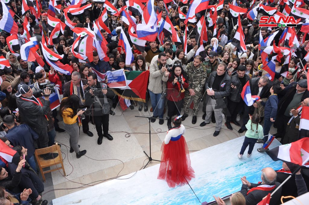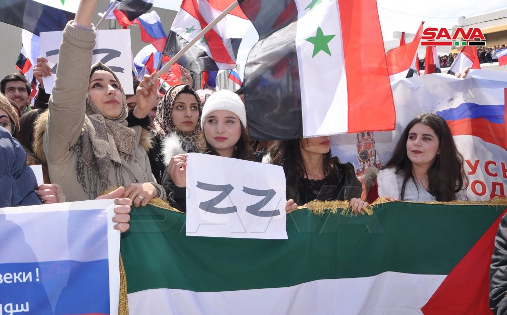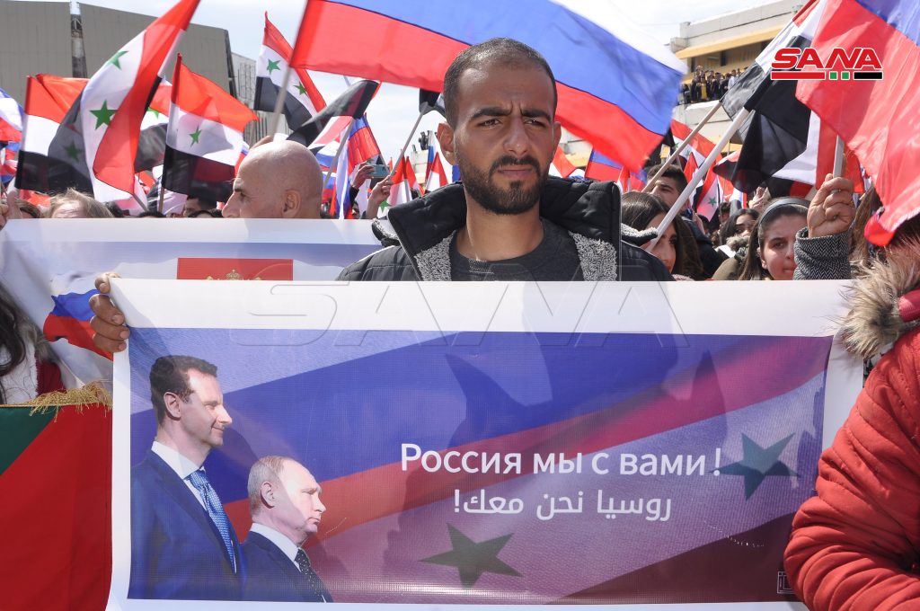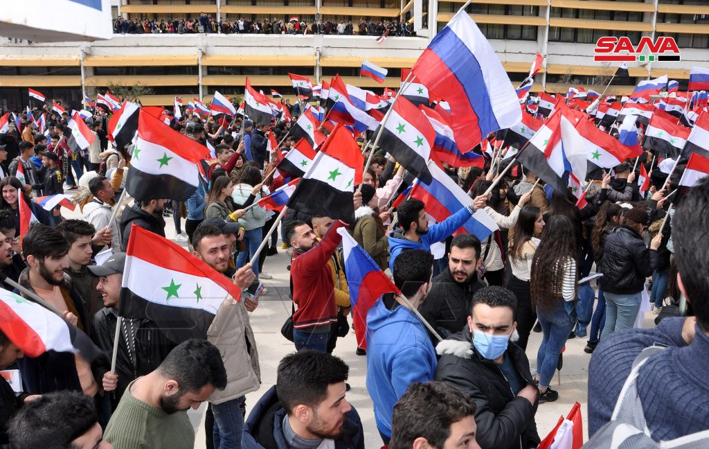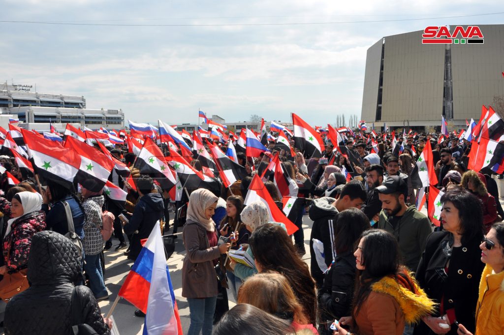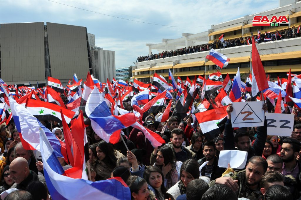وعبر المشاركون عن وقوف الشعب السوري إلى جانب روسيا وشعبها ضد القوى الغربية التي كانت وما زالت تسعى للنيل من الدول والشعوب ذات السيادة ومحاولة تقسيمها ونهب ثرواتها مؤكدين أن العملية الخاصة التي ينفذها الجيش الروسي في أوكرانيا تأتي في إطار المحافظة على السلم والأمن العالميين.