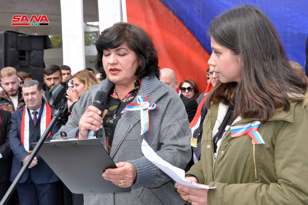 بدورها عبرت مديرة العلاقات العامة للجالية الروسية السورية في سورية اينا بريتكوف في كلمة لها عن شكرها للشعب السوري “لتضامنه مع الشعب والجيش والقيادة الروس في هذه المواجهة وفي هذه الأوقات حيث تواجه روسيا وسورية قوى الامبريالية الاستعمارية والارهاب وهما سينتصران معا وسيبقيان مع بعضهما إلى الأبد”.