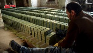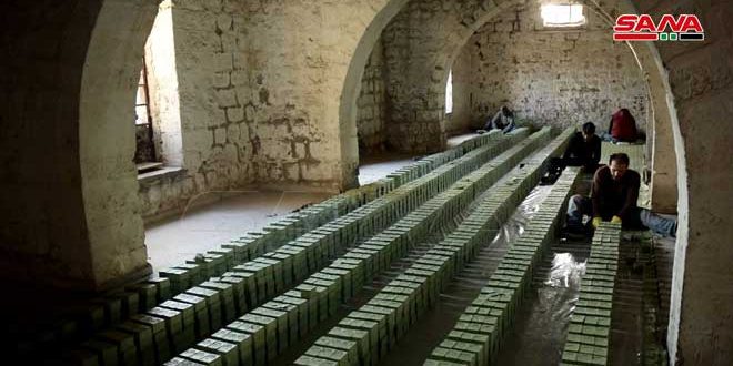 وتابع.. بعدها تتم إضافة زيت الغار الطبيعي ثم ضخ الصابون السائل اللزج وفرشه على مسطحات مستوية تحت أسقف القباب الحجرية وعزله عن الأرض باستخدام النايلون لحفظه من الشوائب ويترك لنحو عشر ساعات حتى يجف تليها عملية التقطيع اليدوي باستخدام الجوزة وهي ألة خشبية لها مسننات يتم التحكم بها وفق أحجام الصابون المنتج الطويل أو المربع.