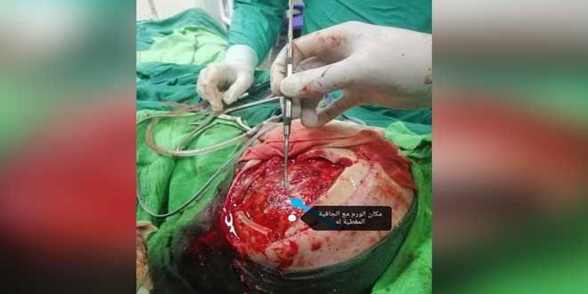 وتابع الدكتور عمار: لوحظ أيضاً وجود دفش لعناصر الخط الناصف والجهاز البطيني نحو الجهة اليمنى بأبعاد (74-62-46) معززة للحقن بشدة ما يتطلب إجراء عمل جراحي تحت التخدير العام بمدخل صدغي جداري أيسر مبيناً أنه تم كشف الورم وتسليخه عن النسيج الدماغي المحيط به وتخثير الأوعية المغذية له واستئصاله بشكل كامل مع الطبقة آلام الجافية المغطية له ليقوم الفريق الطبي المختص بعدها بإجراء ترميم للجافية مكان الورم المستأصل برقعة من سمحاق القحف.