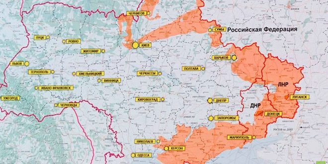 نشر الجيش الروسي خريطة للأراضي التي سيطر عليها منذ بدء العملية العسكرية الخاصة لحماية إقليم دونباس مظهراً من خلالها إطباقه الحصار على العاصمة الأوكرانية كييف ومدينة خاركوف ثاني أكبر المدن الأوكرانية.