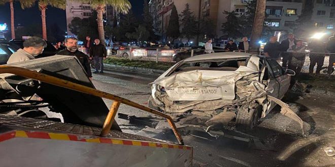 أصيب شخصان جراء تدهور سيارة نوع لاند كروز واصطدامها بسيارتين الأولى نوع هوندا سفك والثانية نوع كيا ريو على أوتوستراد المزة مقابل حديقة الطلائع جانب القصر العدلي ما أدى إلى وقوع إصابتين وأضرار مادية بالسيارات.