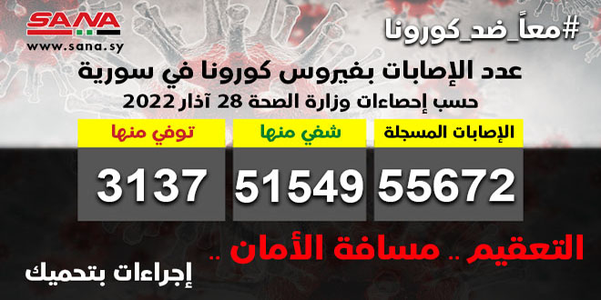 وأوضحت الوزارة في بيان تلقت سانا نسخة منه أن عدد الإصابات المسجلة في سورية بلغ حتى الآن 55672 شفي منها 51549 حالة وتوفي 3137 حالة.