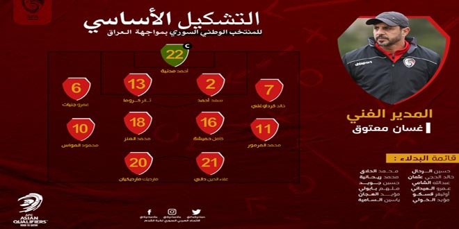 أعلن المدير الفني لمنتخب سورية بكرة القدم للرجال التشكيلة التي سيخوض بها منتخبنا مباراته الأخيرة في التصفيات الآسيوية المؤهلة إلى كأس العالم 2022 أمام منتخب العراق في وقت لاحق اليوم.