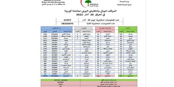 وذكرت وزارة الصحة العراقية في بيان اليوم أن إجمالي الإصابات بكورونا في البلاد ارتفع إلى 2319209 والوفيات إلى 25163 حالة والمتعافين إلى 2281689 شخصاً.
