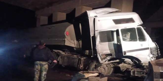 وذكر العميد غياث عاقل مدير الدفاع المدني بحمص لمراسل سانا أن غرفة عمليات الفرع تلقت بلاغاً حول تعرض صهريج مخصص لنقل المحروقات “البنزين” لحادث سير واصطدامه بأعمدة جسر الزارة وانحصار السائق بداخله وعلى الفور تحرك العناصر الى المكان وعملوا بالتعاون مع شرطة الطريق العامة على سحب السائق العالق ضمن كبين الصهريج الذي تعرض لأضرار خفيفة.