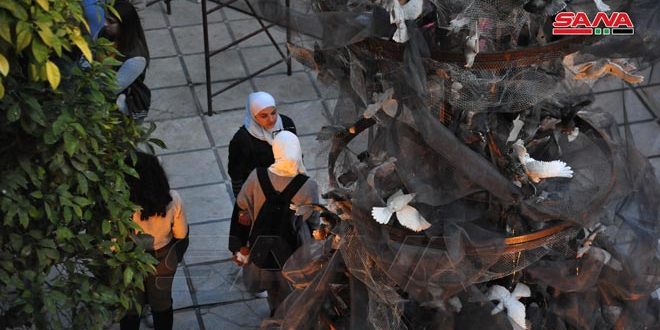 وحول التركيز على الحمامة في مكونات العمل بينت علي أنها استخدمتها لأن هذا الطائر يرمز لمدينة دمشق وللسلام والمحبة لتقدم من خلاله رسالة للعالم من شباب عاشوا آلام الحرب ويريدون أن تعود بلادهم واحة للحب والنقاء.