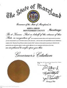 مرة جديدة يحتل السوريون مكانهم في مجالات التميز حيث حصلت الشابة السورية ميرنا أسعد عبيد على جائزة (إحدى أكثر خمس شابات تميزاً لهذا العام في ولاية ميريلاند الأمريكية) التي تعطى من قبل لجنة خاصة بالمرأة تقديراً لإنجازاتها وقدرتها على شغل مناصب إدارية والمساهمة بعمل مؤثر وإيجابي بمجتمعها.