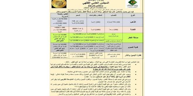 كما حدد المجلس كفارة اليمين والنذر بـ 12 ألف ليرة عن كل مسكين ومجموعها 120 ألفاً ونصاب زكاة المال النقدي ومقدار قيمة النصاب الشرعي للفضة والذهب.