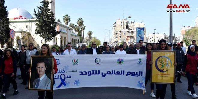 وأشار رئيس نادي المحافظة بحمص وسيم الإخوان لمراسلة سانا إلى أن المسير يهدف إلى تسليط الضوء على الأشخاص الذين يعانون اضطراب التوحد للمساعدة على تحسين نوعية حياتهم كونهم جزءا لا يتجزأ من المجتمع.