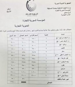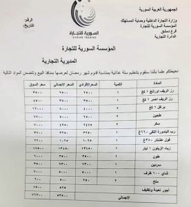 طرحت المؤسسة السورية للتجارة في فرع دمشق سلتين غذائيتين الأولى بـ 53 ألفاً و500 ليرة سورية والثانية بـ 80 ألف ليرة بسعر أقل من السوق بنسبة تتراوح بين 30 و40 بالمئة في جميع صالاتها وذلك طوال أيام شهر رمضان المبارك.