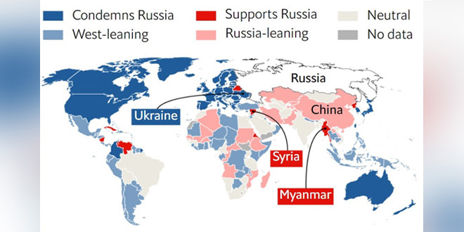 أحصت مجلة إيكونوميست البريطانية الدول التي وقفت إلى جانب روسيا في عمليتها العسكرية الخاصة لحماية سكان دونباس وتلك التي بقيت محايدة معترفة بأن معظم سكان العالم يعيشون في هذه الدول التي تدعم الموقف الروسي أو تتخذ موقفاً حيادياً.