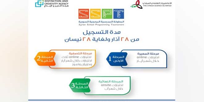 وأشارت الهيئة في إعلانها الذي تلقت سانا نسخة منه اليوم إلى أنه يمكن لطلبة المدارس ممن تتراوح أعمارهم بين 12 و17 سنة ولديهم المقدرة على البرمجة بلغة (++ C) المشاركة في هذه البطولة عبر ملء الاستمارة الإلكترونية الموجودة على الموقع الإلكتروني لهيئة التميز والإبداع.
