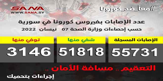 وأوضحت الوزارة في بيان تلقت سانا نسخة منه أن عدد الإصابات المسجلة في سورية بلغ حتى الآن 55731 شفيت منها 51818 حالة وتوفيت 3146 حالة.