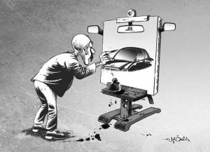 وتصور رسوم خليل الفائزة فكرة المرآة الخلفية في السيارات بأسلوب فني وناقد في مقاربات سياسية وفنية واجتماعية ذات أبعاد ودلالات نابضة بالتأويل وما يذهب إليه.