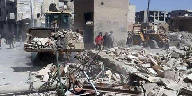 بدورها قامت آليات محافظة ريف دمشق بإزالة الأنقاض التي خلفها انهيار المبنى وفتح الطرقات في محيطه.