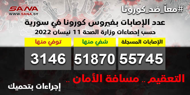 وأوضحت الوزارة في بيان تلقت سانا نسخة منه أن عدد الإصابات المسجلة في سورية بلغ حتى الآن 55745 شفي منها 51870 حالة وتوفي 3146 حالة.