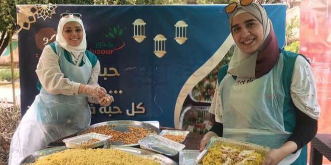 نشرة سانا الشبابية واكبت يوم عمل كامل لمبادرة “مطبخ حبة بركة” ضمن “كافيه سوسيت” في حديقة تشرين بدمشق حيث اعتبرت خلود رجب رئيس مجلس إدارة جمعية جذور المبادرة تجربة إيجابية في مجال العمل الإنساني وخطوة لمساعدة الأسر والعائلات المحتاجة خاصة في شهر رمضان لافتة إلى أن مطبخ حبة بركة يشمل عدة حملات فهو مطبخ تنموي يستهدف نساء ناجيات من العنف وأطفالاً فاقدي الرعاية الأسرية كذلك.