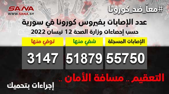 وأوضحت الوزارة في بيان تلقت سانا نسخة منه أن عدد الإصابات المسجلة في سورية بلغ حتى الآن 55750 شفي منها 51879 حالة وتوفي 3147 حالة.
