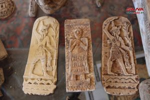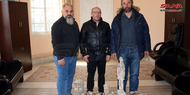 كرمت مديرية آثار حمص اليوم العمال الثلاثة الذين عثروا على الحقيبة التي تحتوي قطعاً أثرية ونماذج جصية أثناء عملهم بإزالة الأنقاض من المدينة القديمة وعملوا على تسليمها إلى دائرة الآثار بالمحافظة.