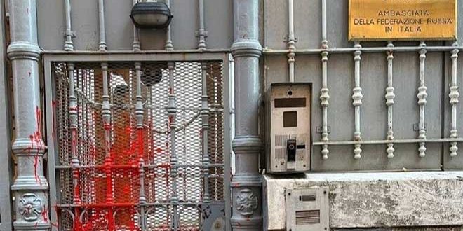 وكانت وسائل إعلام روسية أفادت في وقت سابق من هذا اليوم بتعرض مبنى السفارة الروسية في روما لهجوم تم خلاله صب طلاء على الباب الأمامي.