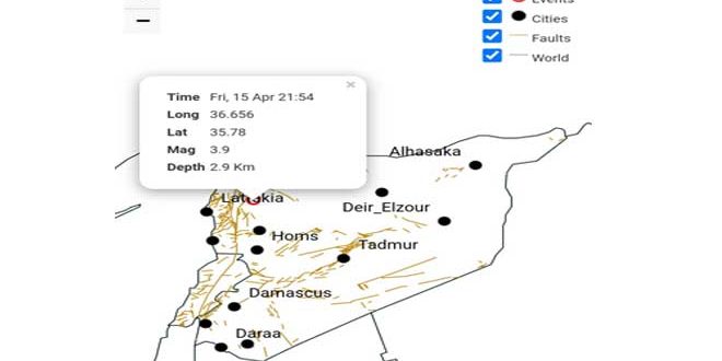 وذكر المركز الوطني للزلازل في بيان تلقت سانا نسخة منه أن الهزة حدثت في الساعة 9.54 مساء بالتوقيت المحلي على عمق 2.9 كم وبعد 66 كم جنوب غرب مدينة حلب.