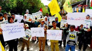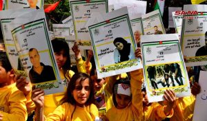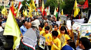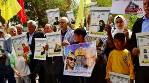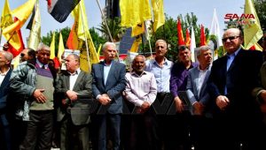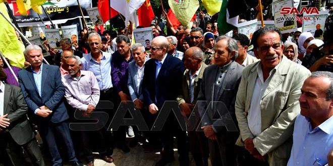 ورفع المشاركون في الفعالية أعلام سورية وفلسطين وصوراً للأسرى في سجون الاحتلال الإسرائيلي ولافتات تتضمن عبارات عن ذكرى الجلاء وعن استمرار النضال حتى التحرير وطرد المحتل.