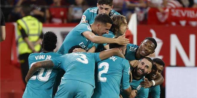 فاز ريال مدريد على إشبيلية بثلاثة أهداف مقابل هدفين في إطار منافسات الجولة 32 من الدوري الاسباني لكرة القدم (الليغا).