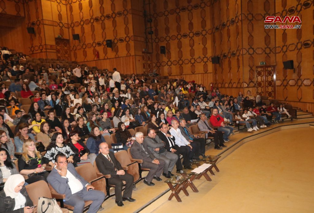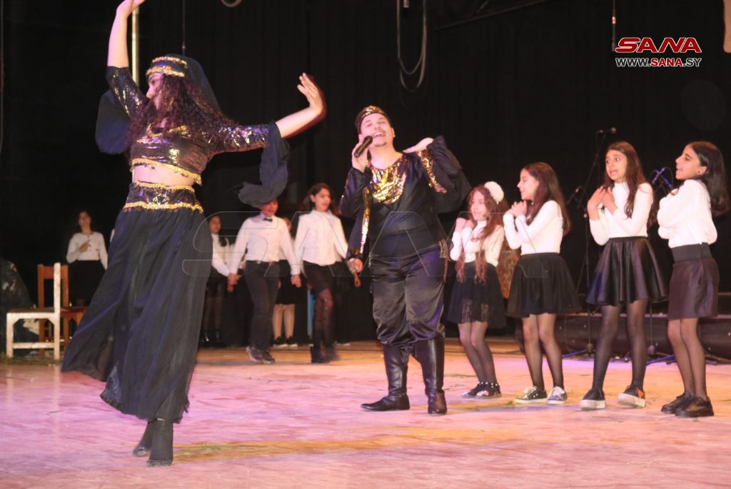 وقدمت فرقة كورال “صالة رفيق سكاف” المؤلفة من 47 طالبا وطالبة مجموعة من الأغاني من ضمنها موشحات وأعمال موسيقية وأغان وطنية مثل “راياتك بالعالي وسورية يا حبيبتي ويا شادي الألحان ويا قصص عم تكتب أسامينا”.