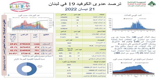 وذكرت الوزارة في بيان لها اليوم أن العدد الاجمالي للإصابات بالفيروس في لبنان ارتفع إلى 1096099 إصابة بينما وصل مجموع الوفيات إلى 10371 حالة.
