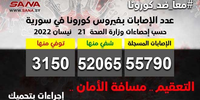 وأوضحت الوزارة في بيان تلقت سانا نسخة منه أن عدد الإصابات المسجلة في سورية بلغ حتى الآن 55790 شفيت منها 52065 حالة وتوفيت 3150 حالة.