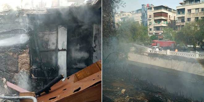 أخمد عناصر فوج إطفاء دمشق اليوم حريقاً نشب ضمن منزل عربي بحي زين العابدين بمنطقة المهاجرين وآخر على كتف نهر بردى بساحة الميسات بدمشق.