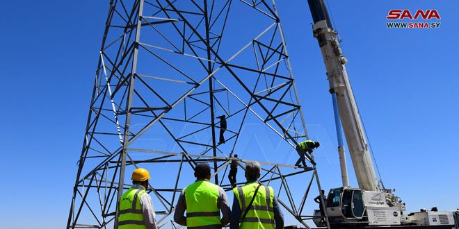 وذكر نجار أن الورشات الفنية تعمل بجهود استثنائية منذ نحو عشرة أيام على إصلاح ونصب الأبراج حيث تم في المرحلة الأولى تطبيق وتركيب القاعدة التي يستند عليها البرج على الأرض ومن ثم الاستعانة بالرافعات الكبيرة لرفع البرج ونصبه فوق القاعدة وتمكينه وكل ذلك يتم بخبرات الكوادر الوطنية مبيناً أنه سبق عملية النصب فتح وشق طريق ترابي لتتمكن الورشات والآليات من الدخول إلى مواقع العمل وإصلاح الأعطال استعداداً لمد النواقل وربط الأبراج مع بعضها وتأمين التغذية بعد ربط المحطات وإغلاق الدارة.