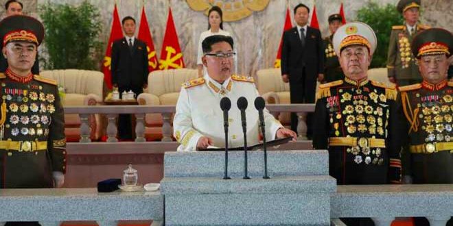ونقلت وكالة الانباء الكورية المركزية عن كيم قوله مساء أمس خلال عرض عسكري بمناسبة الذكرى التسعين لتأسيس الجيش الثوري الشعبي لكوريا الديمقراطية “إن المهمة الأساسية لقواتنا النووية هي منع الحرب .. لكنها لا يمكن أن تقتصر فقط على هذه المهمة في حال التعدي على مصالح البلاد الأساسية أو أن تلتزم بتلك المهمة إذا نشأ وضع لا نرغب بحدوثه على هذه الأرض .. وسيكون على القوات النووية المضي قدما في مهمتها الأخرى في حال حاولت دول أخرى التعدي على المصالح الأساسية لكوريا الديمقراطية”.