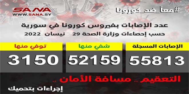 وأوضحت الوزارة في بيان تلقت سانا نسخة منه أن عدد الإصابات المسجلة في سورية بلغ حتى الآن 55813 شفي منها 52159 حالة وتوفي 3150 حالة.