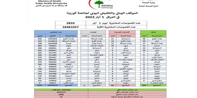 وسجل العراق أمس 110 إصابات بالفيروس كورونا.