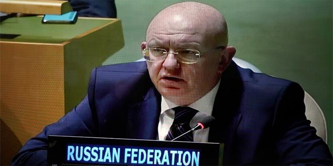 وذكرت وكالة تاس أن مندوب روسيا لدى الأمم المتحدة فاسيلي نيبينزيا أكد في اجتماع غير رسمي لمجلس الأمن الدولي بـ “صيغة اريا” اليوم أن السلطات الأوكرانية ورعاتها الغربيين لا يريدون تسليط الضوء على الواقع موضحاً أن القوات الأوكرانية نشرت أسلحتها الثقيلة في المناطق السكنية واستخدمت المدنيين دروعاً بشرية في انتهاك للقانون الإنساني الدولي.