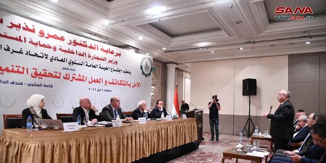 تركز اجتماع الهيئة العامة لاتحاد غرف التجارة السورية الذي عقد اليوم على مناقشة سبل تحقيق التنمية الاقتصادية وتعزيز التعاون والتنسيق بين اتحاد غرف التجارة من جانب ووزارة التجارة الداخلية وحماية المستهلك والحكومة من جانب آخر لتسهيل العمل التجاري وانسياب السلع في الأسواق.