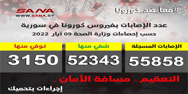 وأوضحت الوزارة في بيان تلقت سانا نسخة منه أن عدد الإصابات المسجلة في سورية بلغ حتى الآن 55858 شفيت منها 52343 حالة وتوفيت 3150 حالة.