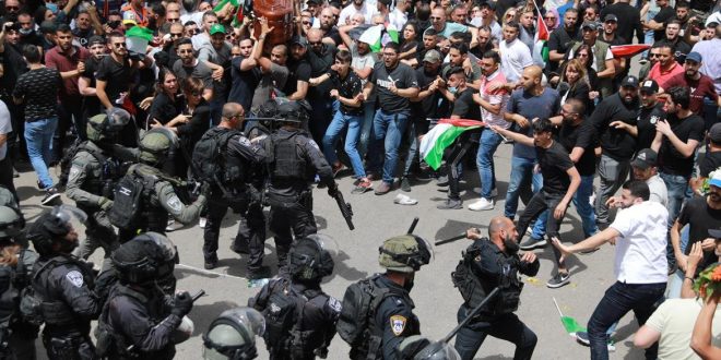 أصيب عشرات الفلسطينيين اليوم جراء اعتداء قوات الاحتلال الإسرائيلي على موكب تشييع جثمان الصحفية الفلسطينية شيرين أبو عاقلة أثناء محاولة إخراجه من المستشفى الفرنسي بمدينة القدس المحتلة.
