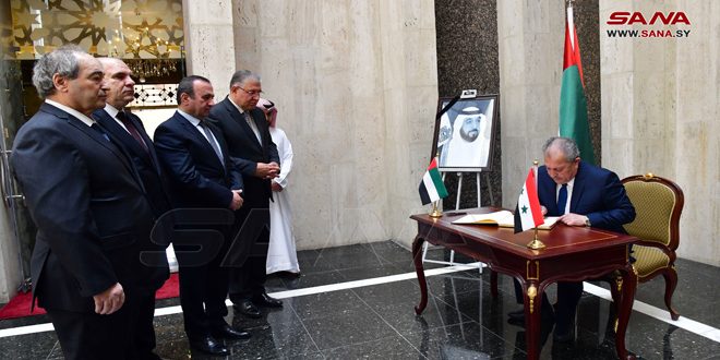 قدم رئيس مجلس الوزراء المهندس حسين عرنوس واجب العزاء بوفاة الشيخ خليفة بن زايد آل نهيان رئيس دولة الإمارات العربية المتحدة وذلك خلال زيارته سفارة الإمارات بدمشق اليوم.