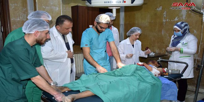 أصيب ثلاثة مدنيين بجروح متفاوتة جراء انفجار لغم أرضي من مخلفات الإرهابيين في بلدة سكيك بريف حماة الشمالي الشرقي.
