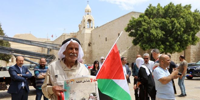 بدوره أكد رئيس بلدية بيت لحم حنا حنانينا أن الجرح الغائر لم يندمل بعد 74 عاماً وكلنا يقين بأن الحق لا يضيع وفلسطين ستعود لأهلها مهما طال الزمن.