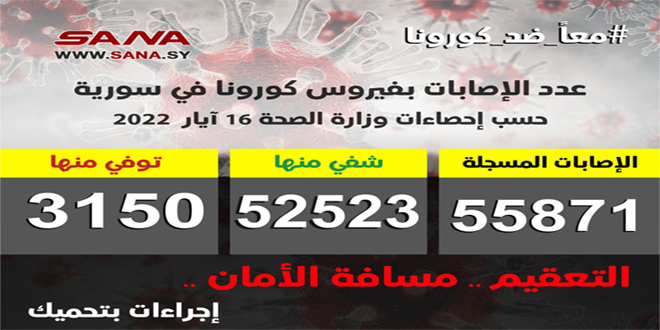 وأوضحت الوزارة في بيان تلقت سانا نسخة منه أن عدد الإصابات المسجلة في سورية بلغ حتى الآن 55871 شفيت منها 52523 حالة وتوفيت 3150 حالة.
