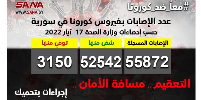 وأوضحت الوزارة في بيان تلقت سانا نسخة منه أن عدد الإصابات المسجلة في سورية بلغ حتى الآن 55872 شفي منها 52542 حالة وتوفي 3150 حالة.
